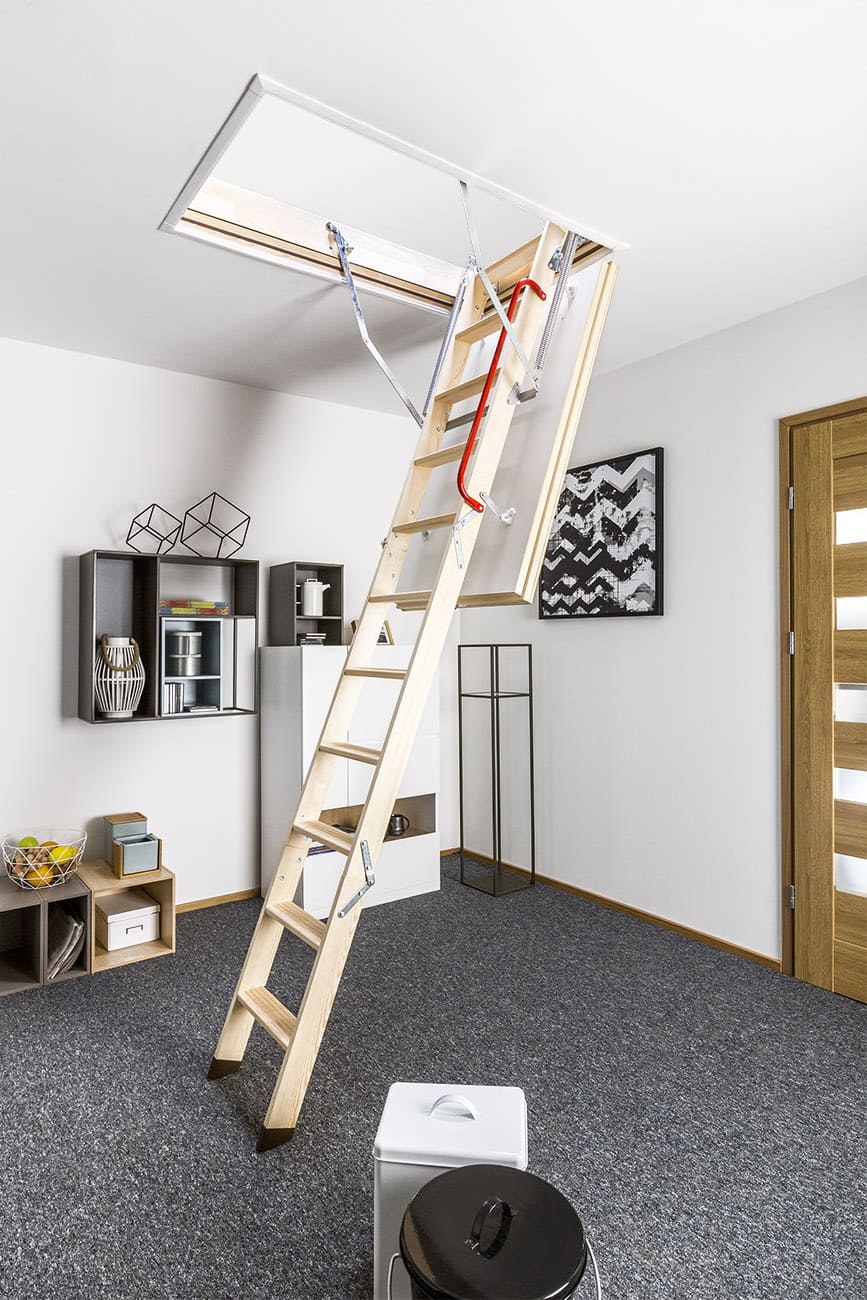 Люк с лестницей / Деревянная лестница на чердак FAKRO Термоизоляционная лестница LTK Thermo – практичная раскладная модель чердачной лестницы, выполненная из сосновой древесины. Толщина крышки люка составляет 66 мм, поэтому изделие подходит для домов со значительной разницей температур между этажами. Отделка белым ДВП позволяет органично вписать припотолочную часть конструкции в классический дизайн. Поручни и антискользящие ступени обеспечивают безопасность эксплуатации.
